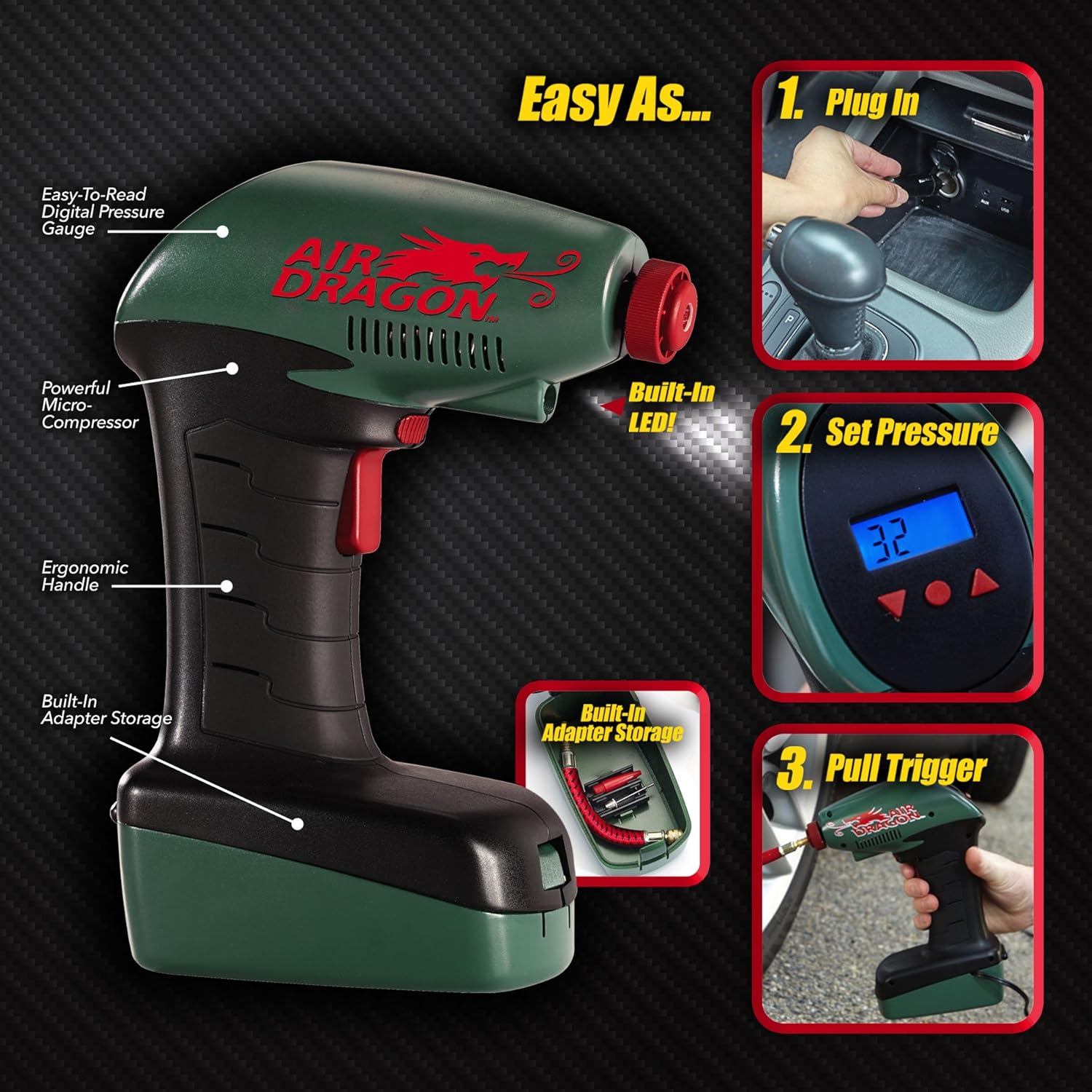 4. Includes Air Dragon with built in LED light for nighttime use, 14 foot car power cable, pressure Hose, ball adapter pin, and balloon adapter pin